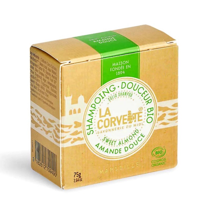 Prodotto con ingredienti 100% di origine naturale, questo shampoo solido de La Corvette è prodotto con olio d'oliva biologico ed é profumato alla mandorla dolce.